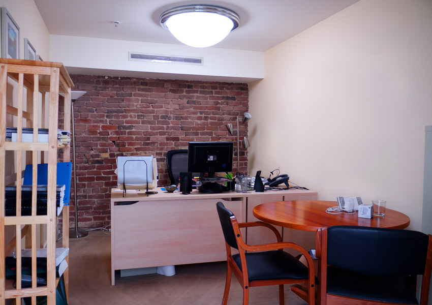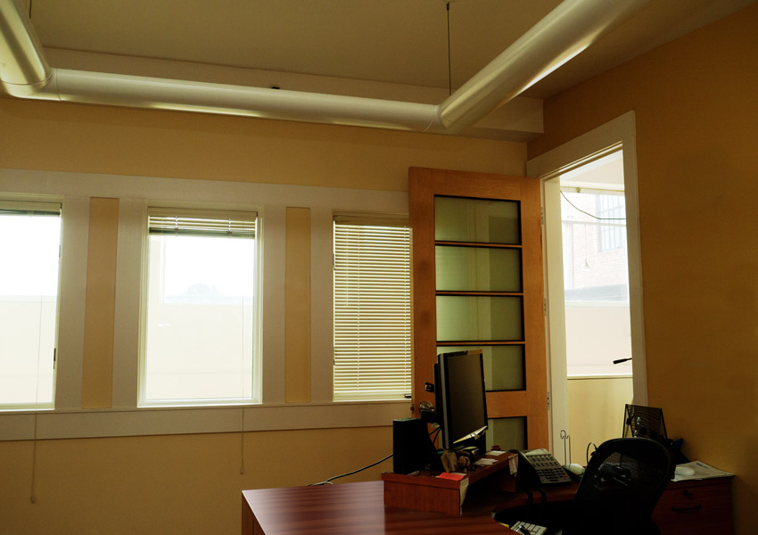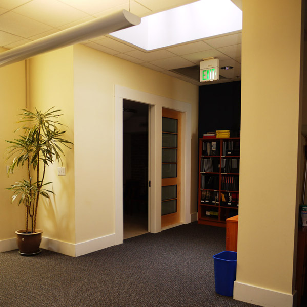 This larger office on the 3rd floor includes illumination from two windows and a skylight