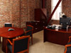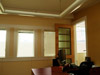 Built-in cabinets and a recessed ceiling box create an elegant space for meeting with clients or just taking a coffee break