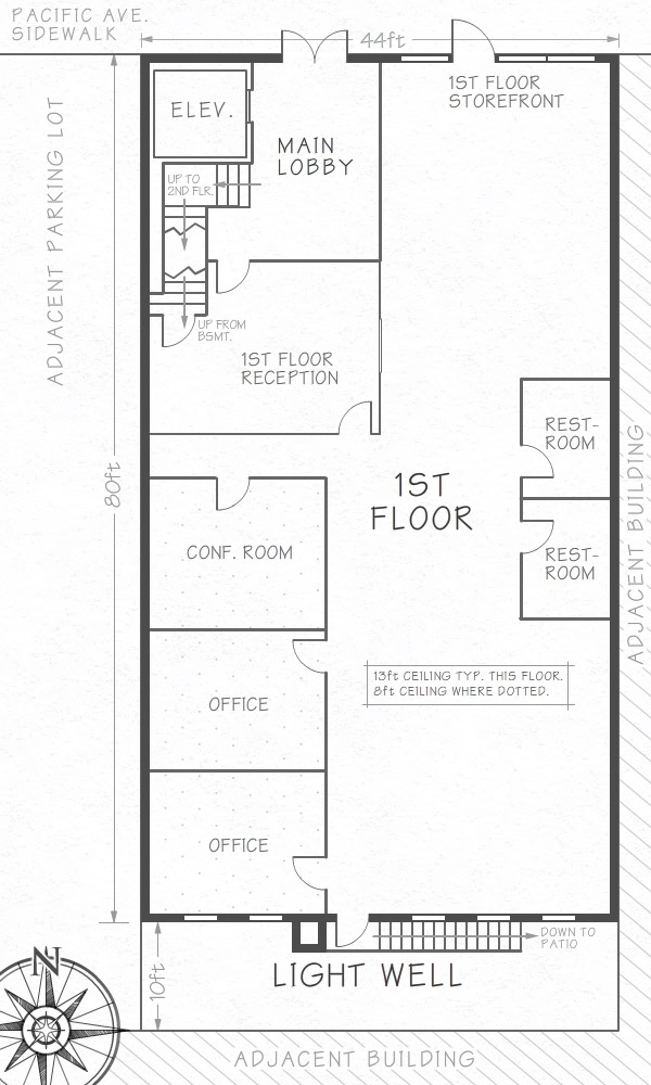 325 Pacific provides three floors of office space, ranging roughly 3,000 to 3,500 ft² each. Utilize one of the existing layouts, or customize your space to precisely meet your needs. Flexible leasing can be arranged for whole, or multiple floors. If your business could use some extra room for records, supplies, or equipment, take advantage of the affordable storage space in the generous full floor basement.